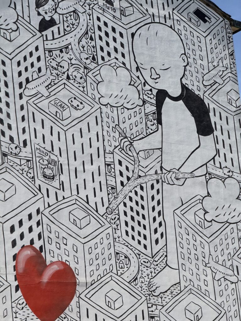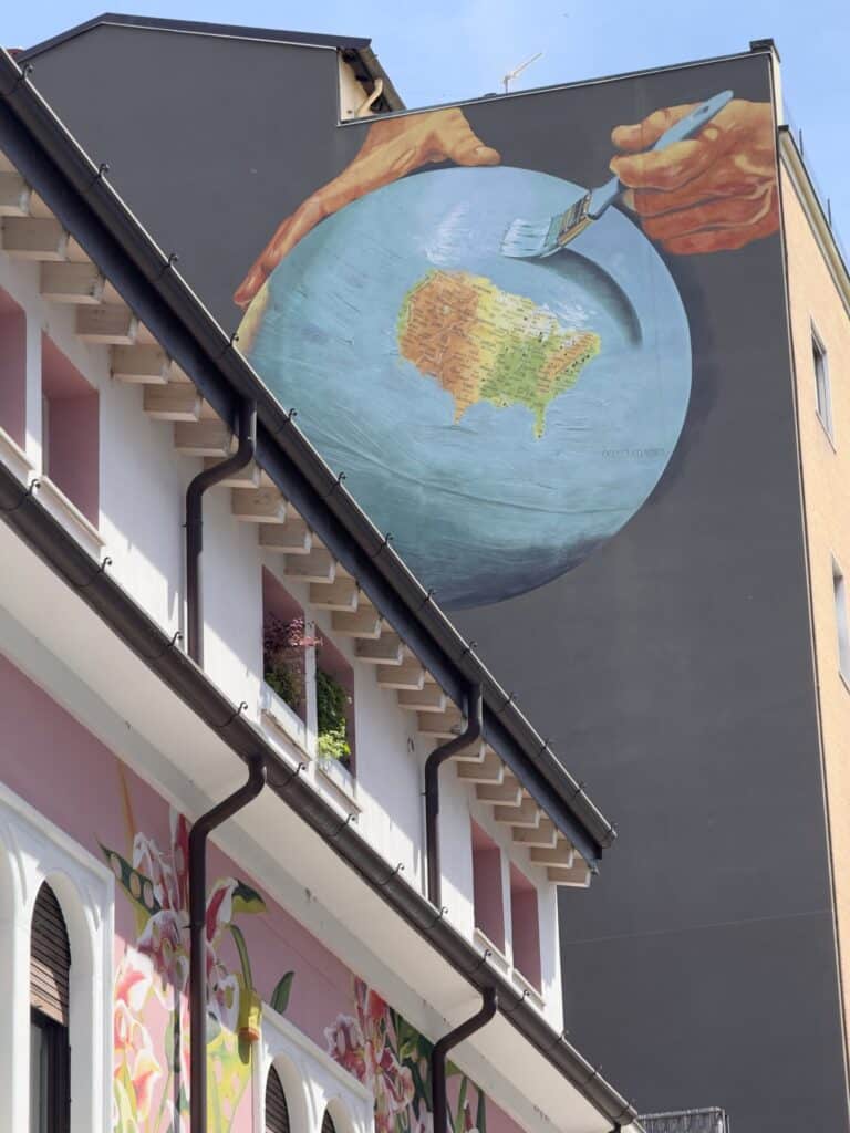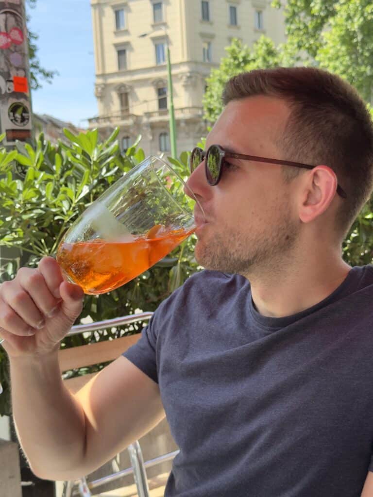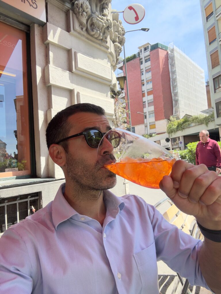 Milan’s bike-share system is incredibly convenient, and we found bikes right next to our hostel. Our first ride led us to the Giardino delle Culture, in Via Emilio Morosini. This small square, surrounded by massive murals and vibrant street art, had a unique creative vibe. There, in the middle of colors and art, we decided it was time for our first Aperol spritz. In Italy, aperitivo time is always the right time.