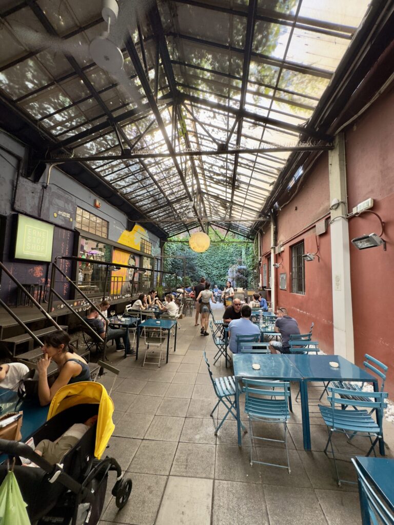 On Sunday evening, we followed friends’ advice and discovered Frida in the Isola neighborhood. This place is a hidden gem: part warehouse, part garden, filled with plants, mismatched furniture, and a laid-back, bohemian vibe. The cocktail list is endless, the crowd eclectic—locals, students, artists—and the atmosphere is warm and vibrant. It was the perfect discovery to extend our evening, which of course ended back in Navigli.