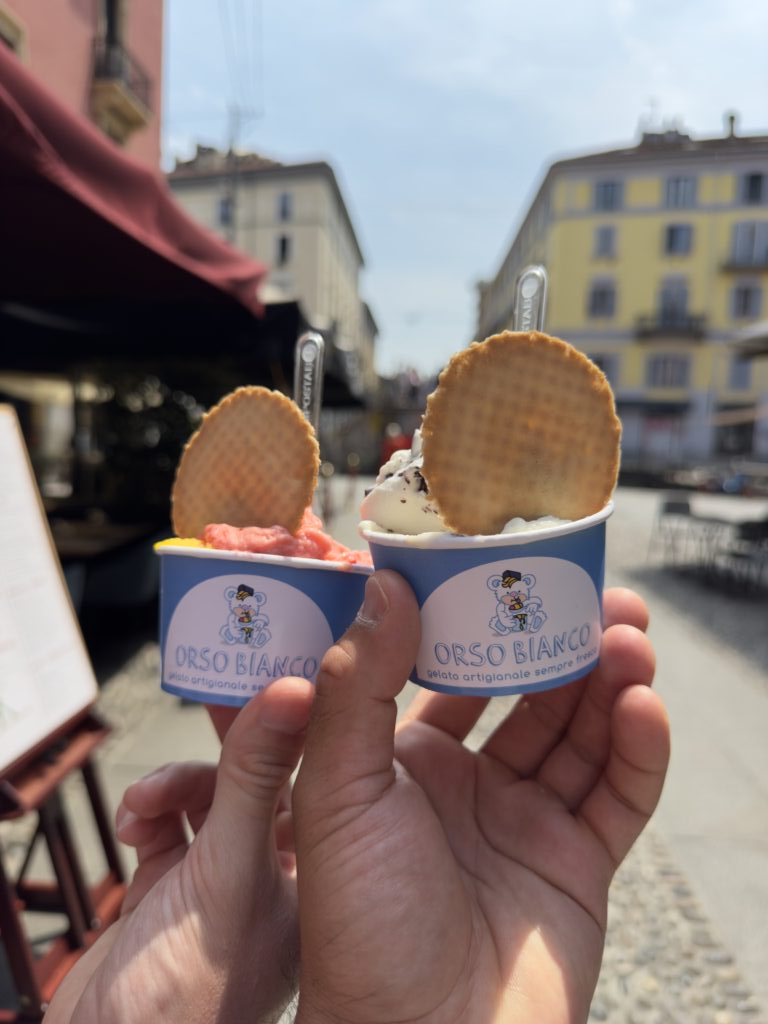 On Monday morning, we enjoyed one last coffee in Navigli, followed by a final stroll along the canals. Before boarding the train back to Lausanne, we couldn’t resist one last plate of pasta and a creamy Italian gelato. The perfect farewell to Milan.