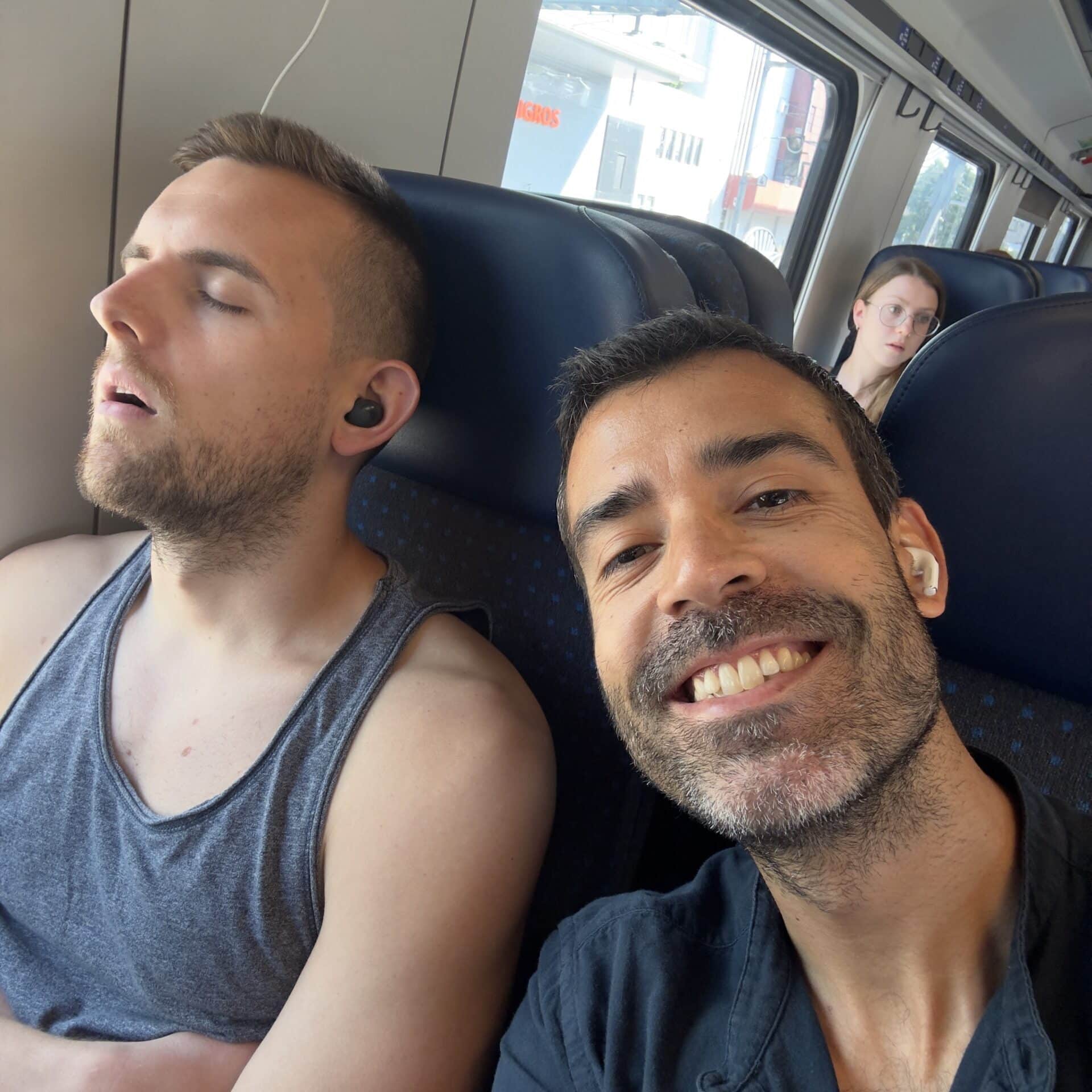 Every June, we take the same path to Zurich Pride, an event we always look forward to. The train ride from Lausanne has become a tradition in itself. We start a series, laugh at the first scenes, and soon enough, Matthieu falls asleep against the window, lulled by the rhythm of the train. Meanwhile, I watch the scenery roll by, enjoying this calm, joyful start.