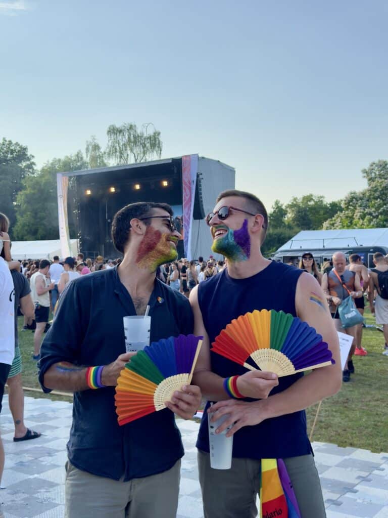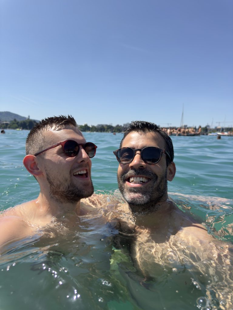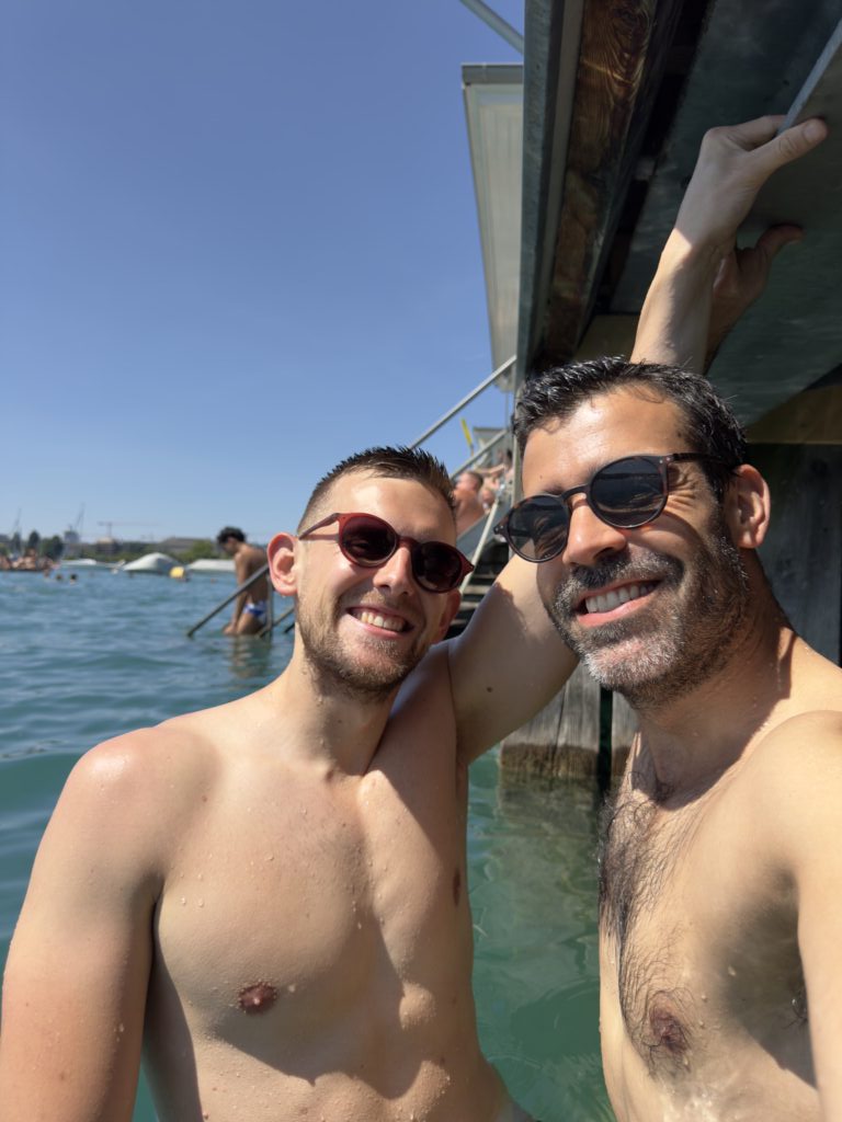 The parade leads us all the way to the Pride village by Lake Zurich. The atmosphere is magical: colorful stalls, friendly smiles, concerts, and even free Swiss chocolate. Best of all, we bump into our brothers in the crowd — Pride always has this mix of celebration, chance and warmth.