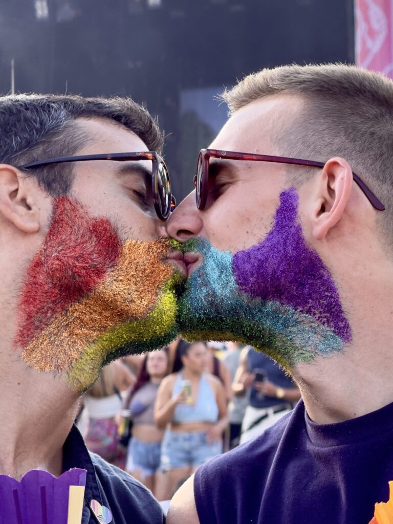 Saturday morning, things speed up. In just twenty minutes each — a personal record — we slip into our rainbow outfits. As always, the question arises: march or spectate? In the end, we do both. We dance behind the floats with the best music, we walk, we watch, we share a few gin tonics in cans.